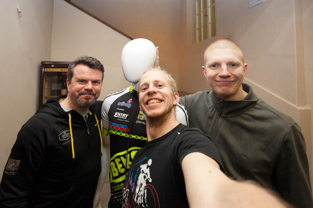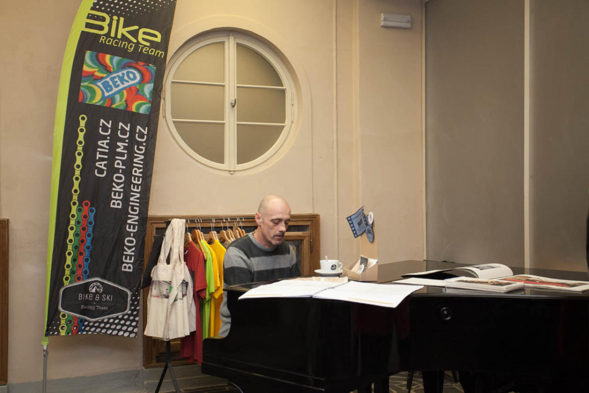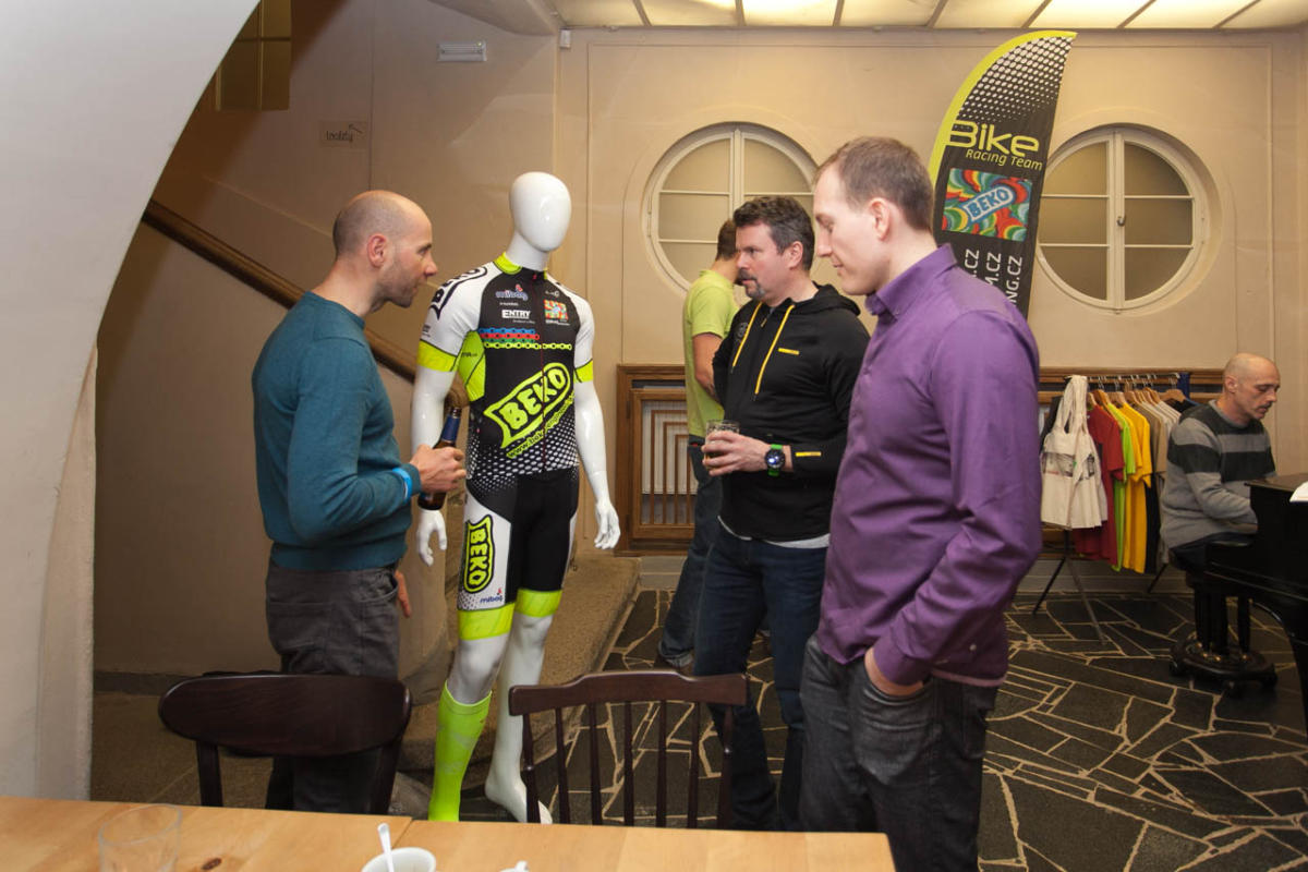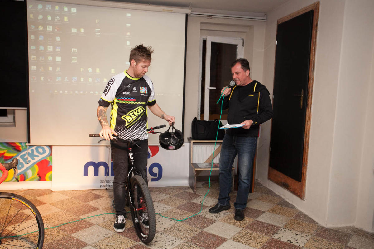 Po odpoledním společném švihu, který připravil Jan Veselý z MC Bike navazovalo představení týmů BSRT společně s beMANIAX MADBIKE. Prezentace byly prokládány trialovou show Honzy Sladkého a prezentací fotek Dana Polmana. Zpestřením byla módní přehlídka, raut a k dobré náladě přispěl točený Falkenštejn a pěkná obsluha :-). Vše se odehrálo v bývalých prostorách hospody Barrandov a v kavárně kina Varšava.